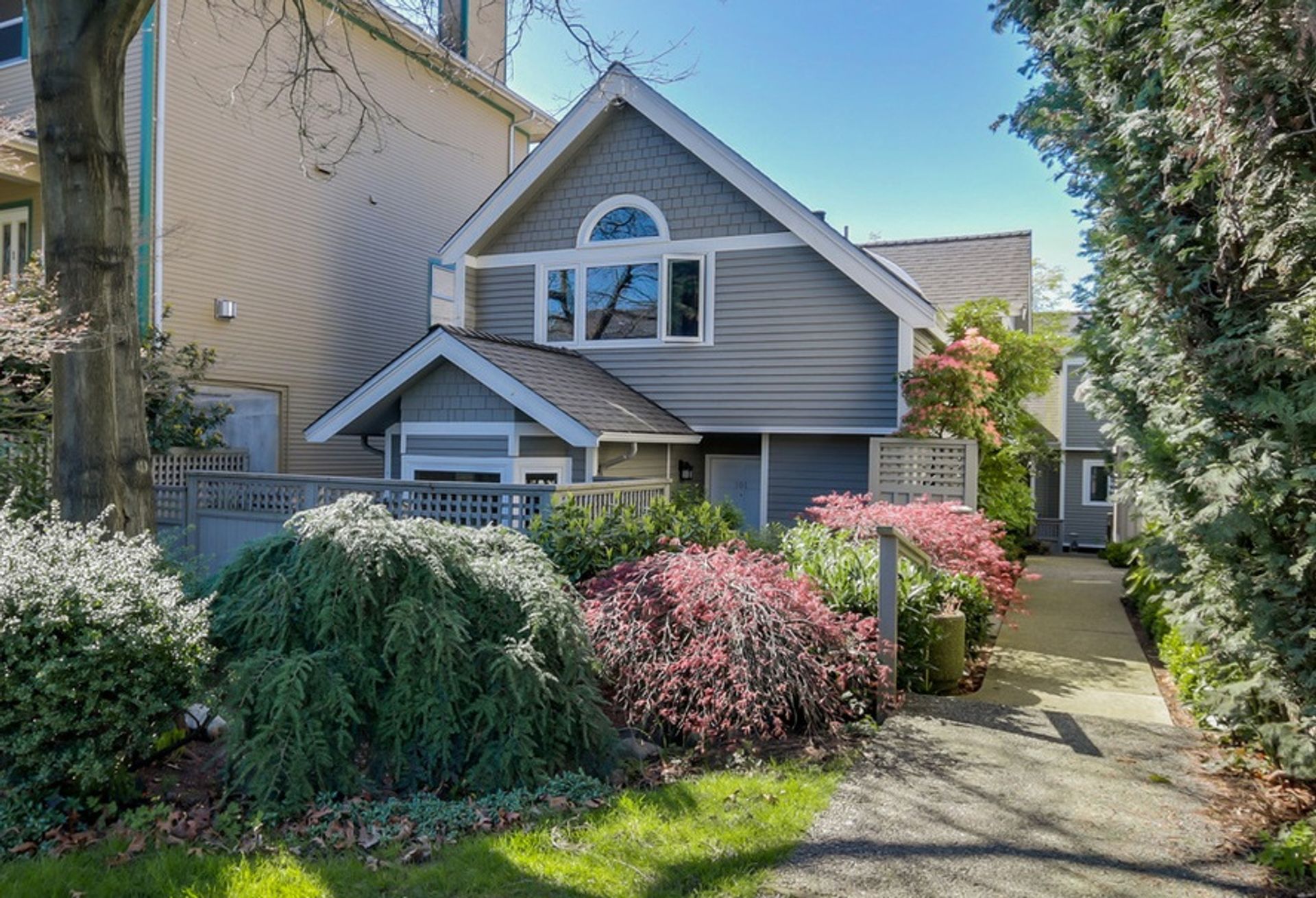 Unique & totally gorgeous! Completely renovated, this detached freestanding townhome is a spacious 2200 SF & shares no common walls. "Les Terrasses" is a great complex. Main level has pot lights throughout, dining area w/vaulted ceiling & French door to 189 SF front patio, high end kitchen w/eating bar & living room w/wood f/p & French door to 272 SF secluded & private S facing bright patio. Up a curved staircase, there are 3 spacious bdrms incl master w/vaulted ceiling, 4 pce enste & 3 pce bthrm. Basement has office, games room, ldry & storage. Ikea Wardrobe, shelves included in sale. Schools:Ridgeway & Sutherland. PKG 5 & 6 assigned CP. Pet must be approved by Strata. Pixilink measures approx, buyer to verify.