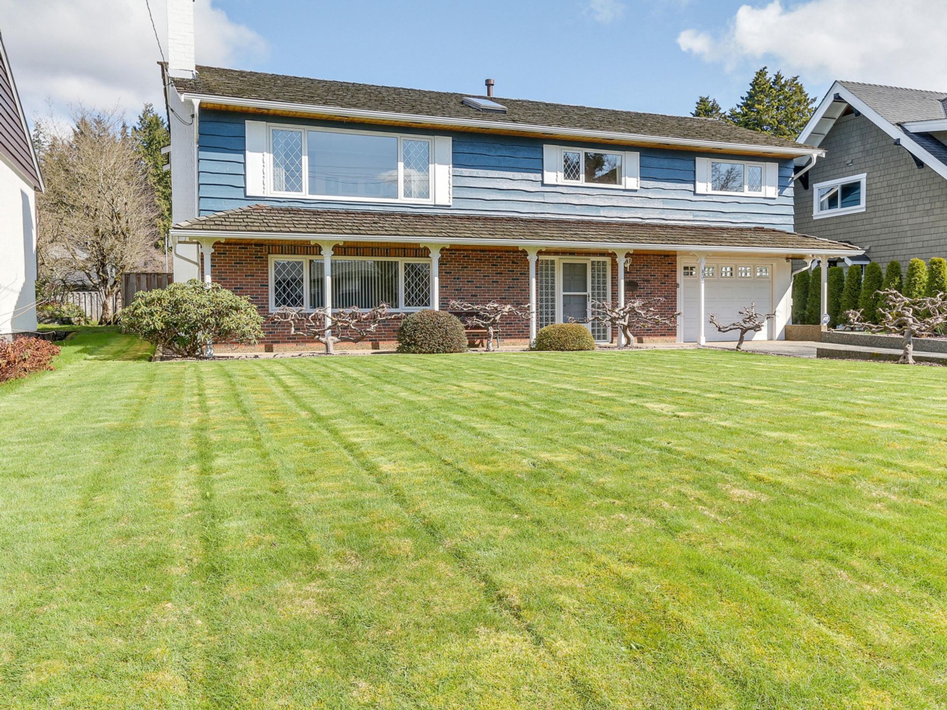 Meticulously maintained & updated in 1998, this super attractive Grand Boulevard home of 2,342 SF is a picture perfect family home. Sitting proudly on a gorgeous & spacious 62.45’ x 146.77’ level lot of 9187 SF, plus there is also lane access to detached 2 car garage. The main level enjoys 3 bdrms, an open plan living/dining area w/gas f/p, a bright eating area w/skylight off kitchen leading out to a 228 SF covered deck. Below, there’s a 621 SF patio w/138 SF workshop at the side. The home’s garden level has a Rec room & den w/fireplace, a 4th bdrm & full bthrm. At the front, there is an att’d 3rd garage w/storage. Close to Brooksbank & Sutherland schools, parks & tennis courts. Lot size & Pixilink measures approximate, to be verified by buyer.